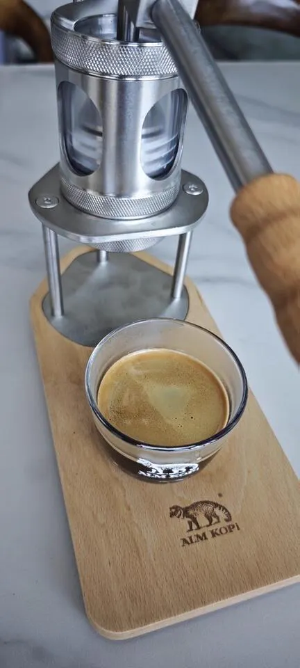 When manually pressing down, keep your body stable and perform a 2Bar soak (this is the charm of a manual espresso machine; a few seconds of soaking can perfectly present the oil flavor). Then you can press down fully, keeping the pressure gauge pointer stable at 9Bar, and stop when you reach the desired weight.